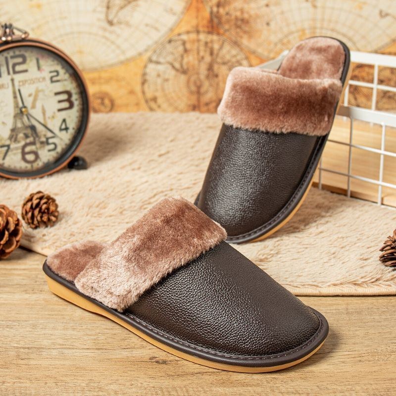 Herr Äkta Läder Plysch Thicken Warmeh Mjuk Slitstark Casual Hemma Bomullstofflor